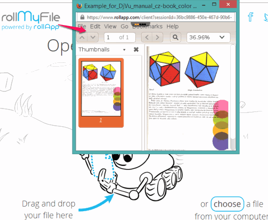 rollMyFile (powered by RollApp) is one of the best website to open almost any kind of file, including DjVu file. You don’t need to create any account and it provides a separate window to open your file. Apart from viewing the file, it automatically generates thumbnails of pages, so you can quickly jump to a particular page. You can also bookmark any page you want and can zoom in (up to 400%) and zoom out on that page easily.