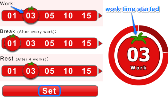 Apart from setting the time for work and break, you can also set ‘Rest’ time. This rest time will come once after every 4 works. It’s completely your choice whether you want to make this break time long, medium or short. After configuration, you can start the very first time interval, and get ready to complete your task.