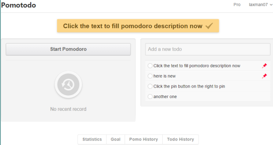 Pomotodo is one of the best Pomodoro Timer website in this list. It combines GTD (Getting Things Done) method with Pomodoro Technique. Using the Pomodoro Technique, you can start work and break time. And using GTD method, you can enter desired tasks that you want to complete. Select a task from the list and start the Pomodoro.