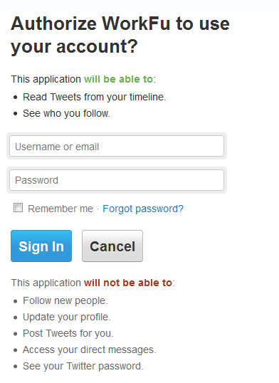 Don’t get me wrong, giving potential employers overview of your Twitter is not something which will reveal anymore information than necessary. As a serious website, WorkFu will not impose on your privacy. You can give Twitter access to WorkFu without sharing your password, the usual way: