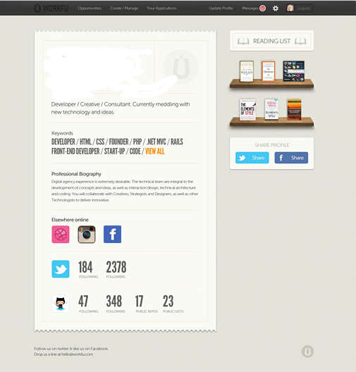 This is the default WorkFu profile, where the workers information is displayed, at least parts of it. At the top there will be a picture of you, with basic information about what you are capable of doing displayed. Going down to the bottom you can find more detailed information with actual skills, an extended biography and even other social networks that the person is using. These days social networks have become an important part of job application, WorkFu offers employers the ability to search for workers based mainly on that, their social interaction.
