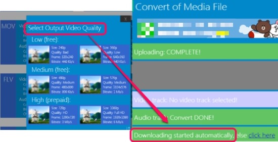 HDconvert.com is a free online media converter that helps to convert many popular format audio video files using preset output formats. It allows to convert media files into mkv, mp4, mov, flv, avi, 3gp, wmv, ogg, mp3, aiff, and in flac format. For each format, you will be able to select the quality level: low & medium, which is a good feature about this online media converter. Thus, you can convert media files for your smartphone, TV quality, and for other devices. It can even extract audio from video files. But one media file at a time can be converted with HDconvert.com.