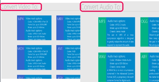 Simply access homepage of HDconvert.com and select any output video format or audio format. Its homepage link is present at the end. As visible in screenshot below, you can choose ‘Convert Video To‘ option to convert PC video into any supported video format. Or else, if you want to extract audio from video file, or audio file into another audio format, then you can select ‘Convert Audio To‘ option.