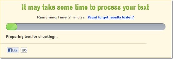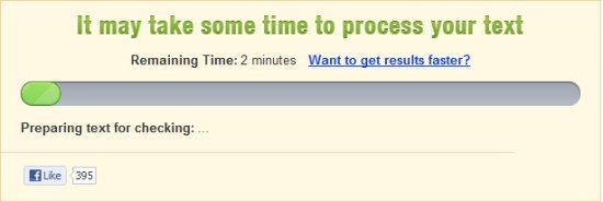 On looking at the remaining time, you might be tempted to click on the ‘want to get results faster’ link. However, clicking on it would show you details about the premium subscription. Premium subscription is available for $14.99 a month and is good for uploading larger documents and displaying accurate reports. If you aren’t interested in the same, then you can simply ignore it and wait for your text to get processed. Though the remaining time was mentioned as 2 minutes, it took barely half a minute to display the plagiarism report. However the results might vary depending upon the connection and length of the text.