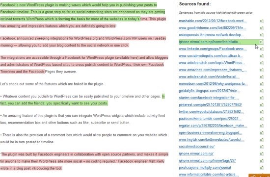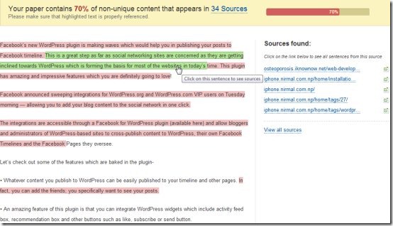 We clicked on ‘View all sources’. As such the list of all these sources was displayed on the right. Suppose you wish to check the sentences taken from a particular source, you can easily do it by clicking on that source. The sentences pertaining to that particular source are highlighted in green.