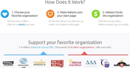 Welzoo is a Chrome extension and website which lets you donate money to your favorite charity without donating anything. Yes, you read it right. It is a very unique concept and a noble one too. Visiting the welzoo website will give you a insight on what needs to be done. All you need to do is install the extension and make Welzoo your browser start page. Now every time you open the browser, Welzoo is going to donate 1 cent to a charity or student organization of your choice.