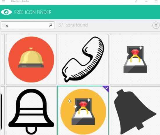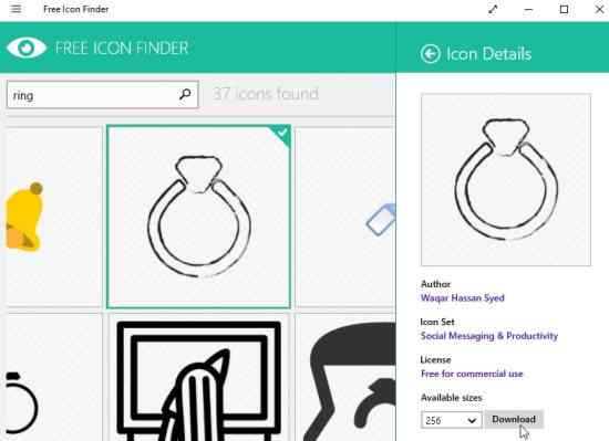 Free Icon Finder is a nice Windows 10 app. It will let you search relevant icons to use for your work. Just keep the licensing information in mind. Go ahead and try it to find and download icons in various sizes.