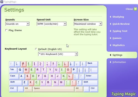 You can turn the sound when you press the keys on or off. You can change the speed unit from words per minute to strokes per minute. You can also change the screen size of the app. Keyboard layout changing option is also there where you can also change the language of the keyboard into 6 different languages.
