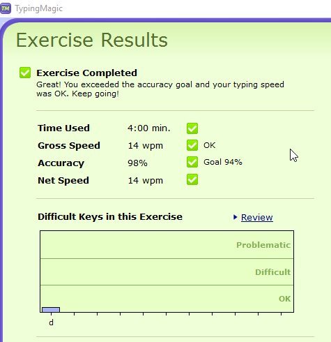 When your exercise is over then you can see a results page as shown in the screenshot above. Where you statistics are shown in a graph format. Doing this typing practice every day for a few minutes will help you increase you typing speed immensely.