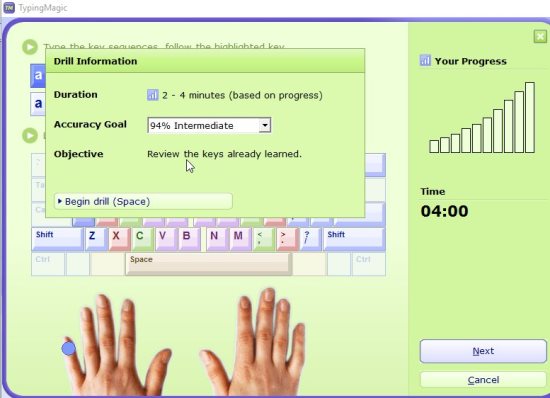Now this screen will show you the drill information and objective. Once you click on begin, the lesson will start. The letters to type will be shown at the top of the page. At the bottom of the page is a image of the hands. There will be a blue pointer on the finger which you have to use to type a particular letter.