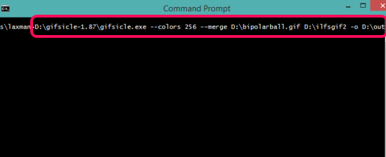You first have to download the zip file of this software and extract it. After this, open Command Prompt window. Enter the command: source location of gifsicle.exe – -colors 256 – -merge ‘your first gif location’ ‘second gif source location’ -o destination directory and output file name.