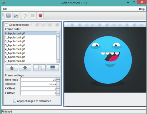 GiftedMotion comes as an executable jar file to merge animated GIFs. As soon as you will add GIFs, it will extract every single frame of those GIFs and will be visible on left sidebar of its interface. On right side, you will be able to see the currently selected frame, like visible in the above screenshot. Before saving the output, you can also move any frame, create copy of a frame, and remove any frame.