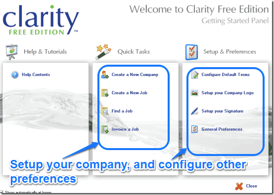 The free version of Clarity can be downloaded from its homepage. The installation is a pretty standard affair. Once you fire up Clarity for the first time after installing it, you’re presented with a Getting Started screen, that can be used to set up your organization, and configure other preferences. You can set up your company, add a logo, as well as add terms and conditions to it. All these details appear on your draft quotations.