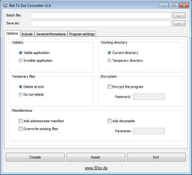 Bat To Exe Converter is a free software which you can use in order to convert bat scripts into EXE applications. Next to conversion you can also edit the application information, icons, change the program version, include different files into the EXE which is converted and adjust various different program settings.