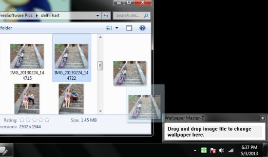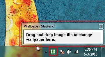 After successful installation, you can launch the app and access it from above your system tray area. There you will see a tiny rectangular window with a message on it. You just need to open the Explorer window, browse image file you want to set as desktop background, drag it from there and drop it to the program window. That’s it! The selected image will be set as your desktop background and you will notice the changes instantly.