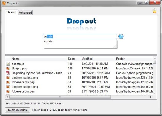 Dropout is a free indexing software which will let you search the ever-changing folders that are not indexed properly because of their constant changing. This thing is most noticeable in case of USB mass storage drives or Dropbox folders. They are so often changed from so many devices that Windows usually fails to index all the files of those folders and drives and the users cannot find them out with any kind of search. The problem is not only that but also the problem of file formats is found in windows searching. Sometimes windows cannot search the files, which are not in the known formats of Windows. In this way many files are excluded from the search in windows searching system.