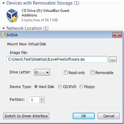 ImDisk Toolkit is a free image mounter for Windows which you can use to mount a very large selection of CD/DVD, hard drive and floppy images like ISO, MDF, CCD, CUE and so on. Selected images can be opened as either virtual hard disk partitions, virtual optical drives or virtual floppy drives, depending on what they were before being created, a partition, CD/DVD or a floppy drive.