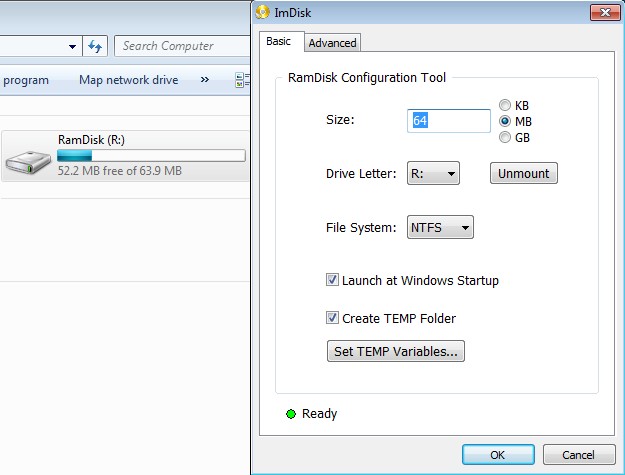 For those who don’t know, RAM disk is a hard drive created from your random access memory, or system memory. Main advantages of such storage is that it’s very fast, files can be copied on it at very high speeds. The downside is that after turning off the computer, data is lost, since this type of storage requires power supply to be there at all times in order to maintain data. For temporary storage, which you need flushed at each computer reboot, this type of drive is perfect. Key features of ImDisk Toolkit are:
