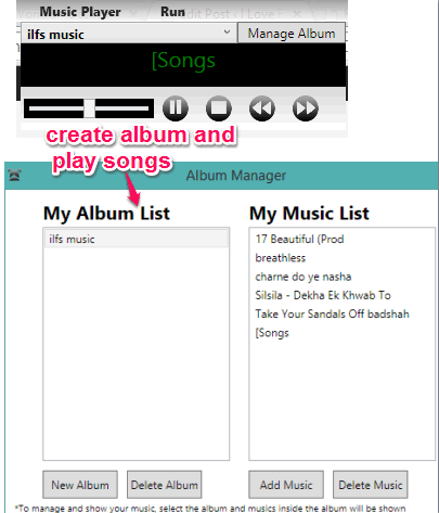 This simple tool lets you create the list of albums and add your mp3 files on those albums. After this, when you will open this tool, it will provide you a small console. Using that console, you can select any album, and start playing your mp3 files. This is useful when you just want to listen to your favorite tracks while working on PC.