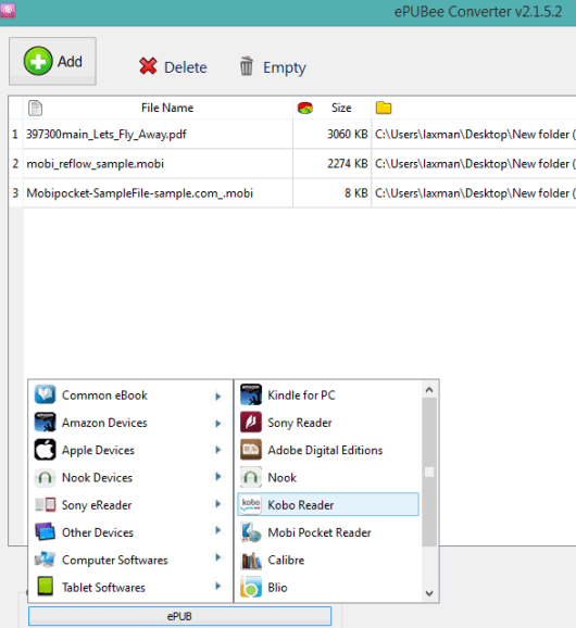 ePUBee Converter is also a good choice to convert ePub, PDF, MOBI, and AZW format files. Although only four input formats are supported by this software, but a huge list of output devices is available to choose from. Whether you want to convert eBooks for Sony Reader, Nook Devices, Apple, Amazon, Kobo, or need to convert your eBooks in any other common eBook format (ePub, PDF, and MOBI), this software is handy.
