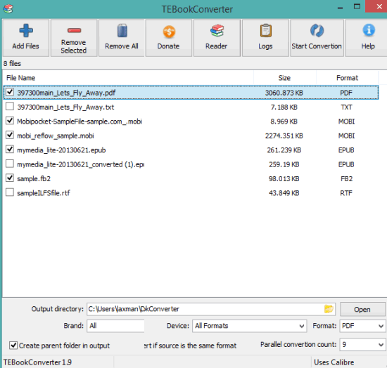 TEBookConverter is also a great eBook converter software that supports bulk conversion. This software uses ‘Calibre’, but it doesn’t mean that it will install that software for conversion. You can add multiple text files, DOC files, PDF, ePub, FB2, LRF, and other supported files. After this, you need to select a particular output format: TCR, TXT, MOBI, ePub, AZW3, PML, SNB, etc. Moreover, you can select up to 16 processes to make the conversion process faster than normal. You will also be able to read any input eBook just by selecting a particular book and clicking on Reader button.