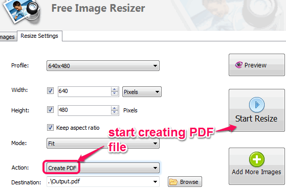 To create a single PDF file from multiple images, you need to add images on its interface. After this, use Resize Settings tab present on its interface. See the screenshot below. Here, you will be able to select the size of images using profile. After this, use Create PDF option from Action drop down menu.
