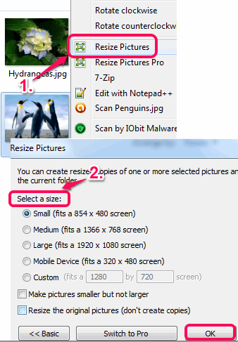 After selecting the image(s), you need to choose Resize Pictures option. Clicking on this option will open a small window. This window lets you choose the preset. After selecting the preset, tap on OK button. Immediately it will create resized images in same directory.