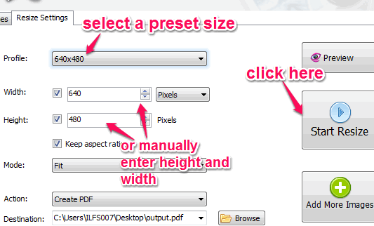 Now you need to switch to Resize Settings tab. In this tab, you will find resize profile option that contains a huge list of presets to set the output size for images. If you want, you can also set height and width for images manually. After setting the output size, select destination folder, and start resizing images.