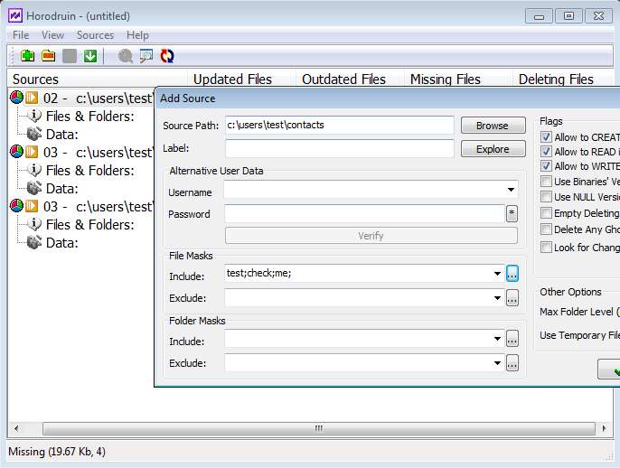 New window will pop-up where you can add the location of the folder that you want to sync. Go over all the options available there, masks for inclusion or exclusion of certain files, flags and other options are set here. You’re gonna have to repeat this for every folder. Note you can save the entire setup and then when you want to repeat it next time you just need to open up the saved setup file. Notice in the background that folders have been added. Now you need to click Sources >> Analyze to scan for changes. If there are differences between the folders, they are gonna be shown in orange.