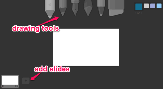 As soon as you select an aspect ratio, it will open up the storyboard editor. You will see a blank slide at the center of the editor, drawing tools at the top, and the option to add new slides at the bottom.