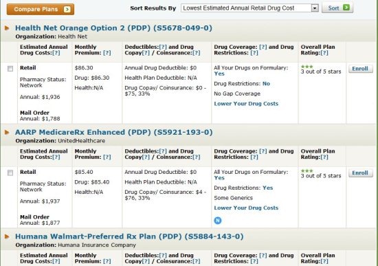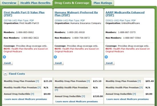 - Now you would see the 3 plans selected by you in a columnar form and click on the tabs to get detailed information about the plan health benefits, overview, drug costs and coverage and plan ratings.