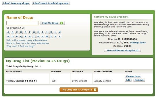 - Enter your prescription drugs if you want to add drugs to drug list, this will estimate the costs and shows you plan that covers your drugs, then click on “My Drug List is Complete”. You can even skip drug entry by clicking on “I don’t take any drugs” or “I don’t want to add drugs now” buttons.