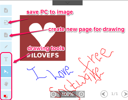To use drawing board, you need to click on icon available at bottom middle part on its interface. By default, only one board will be present there. But you can add more boards using new page option as well. Board contains all the downloaded images as well as tools to modify your images.