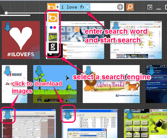Interface of this software lets you choose which search engine you want to use for searching images. Despite the fact that four different search engines can be used together, I didn’t find search results to be better than Google Image Search.