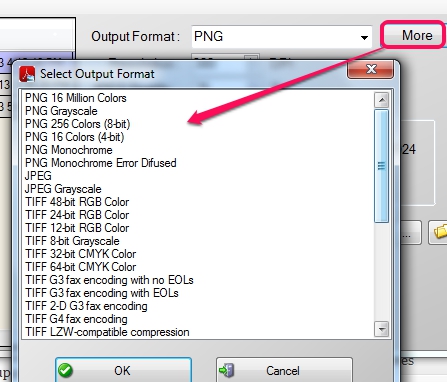 • Multiple output formats are available directly on its main interface. More output formats can be chosen according to the requirement. For each image format, multiple varieties are available. For example, for png image format, you can choose PNG (16 million colors), PNG grayscale, or PNG 8-bit or 4 bit image format.