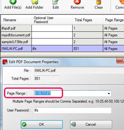 Apart from adding pdf files, it also lets you set page ranges for a multipage pdf file. You can set multiple page ranges and then only those pdf pages will be converted. Just double-click on a pdf file or use Edit button for inserting page range.