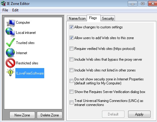 Name, description and icon for a new zone that you add can be edited by clicking on the Name/Icon tab. Flags tab offers various additional settings for managing the selected zone. You can for example turn on a rule so that only SSL encrypted websites with verification are allowed. Once you have the rule setup, you can activate it by opening up Internet Options >> Security inside IE.