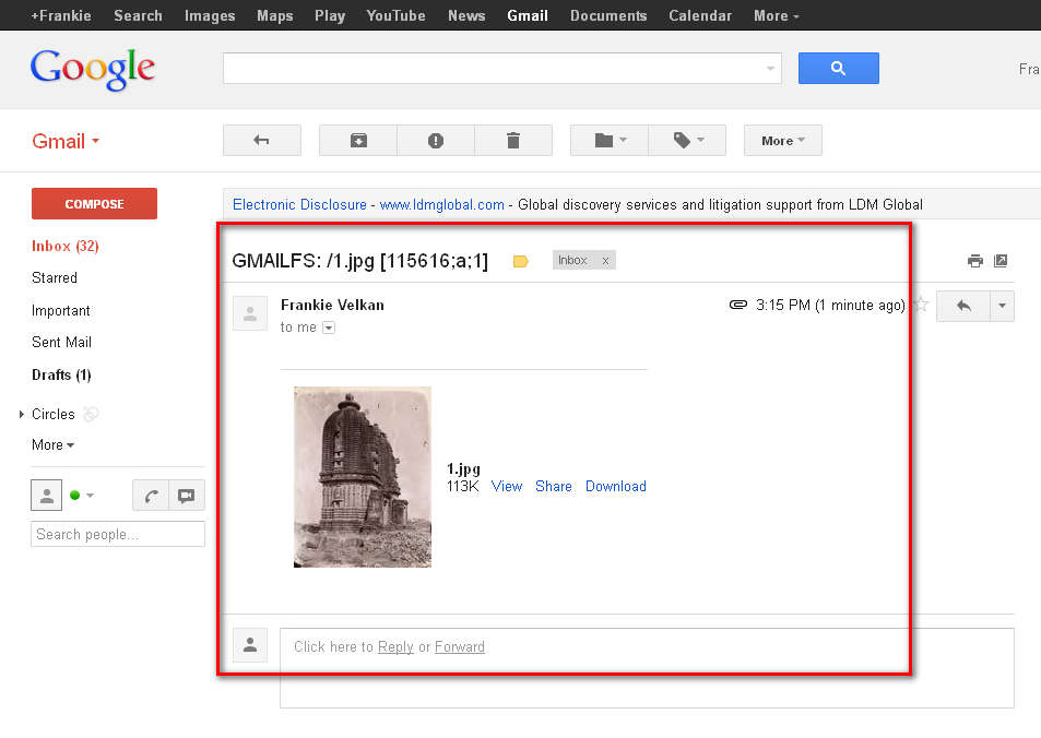 If you are wondering where are the files that you upload gonna be placed, everything will become clear to you once that you open up the Gmail account inside a browser. You’ll then see that each one of the uploaded files, files uploaded through the Gmail Drive service will have their own message created inside your inbox. These messages can be opened, like you can see on the image above, and each one of the files located there can be downloaded from the Gmail account directly, or you can download them the same way that they were uploaded, through the Gmail Drive icon in My Computer.