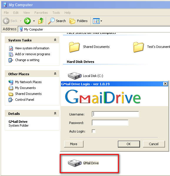 Gmail Drive will create a drive icon for the Gmail Drive service inside the My Computer area of the Windows OS. After clicking on the icon created by Gmail Drive a login window will pop up where you will have to enter your Google username and password so that this free Gmail Drive desktop client can connect to your Gmail Drive account and easily synchronize files that you have stored there or allow you to upload new files to your Gmail Drive web space.