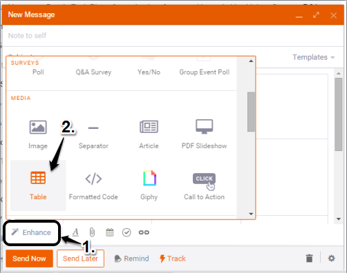 In compose mail window, you will find Enhance option. Clicking on that option will open a pop up that contains a lot of tools. In that pop-up, you need to find and click on Table tool.