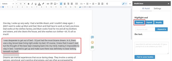 9. At times, you may come across situations when you feel that the text you have typed is quite complex and needs to be simplified and made easier to understand. Just highlight the required text and click on the button ‘Simplify’ and the AI of Wraith Docs will do the job for you in just a few seconds.
