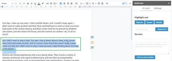 Wraith Docs is a free AI powered text assistant for Google Docs that helps you to Enhance, Rephrase and Simplify your writing in just one click. It is available free of cost as a plugin that you can download from the Google Workspace Marketplace.