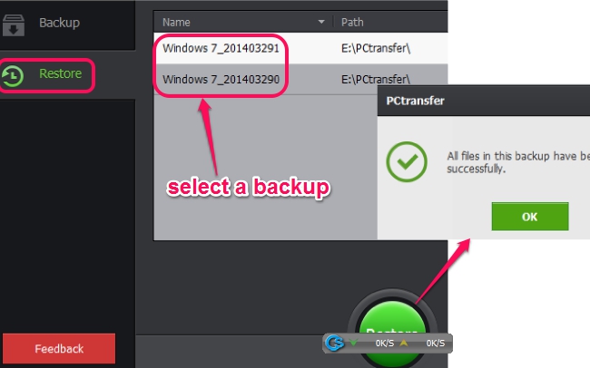 Now whenever you have to restore the backup files, just open its interface, and click on Restore tab. It will provide you list of all created backups. From that list, you can select which backup folder you want to use. Select a backup and tap on Restore button.