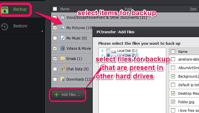 On its interface, just two main tabs are available: Backup and Restore. Using the Backup tab, you can select which files you want to backup. It may include system hidden files (that are protected), desktop files, pictures, music files, user account videos, MS Word/Excel documents available in My Documents, etc. Custom files / folders can also be added to backup list.
