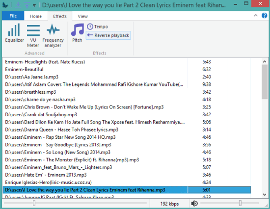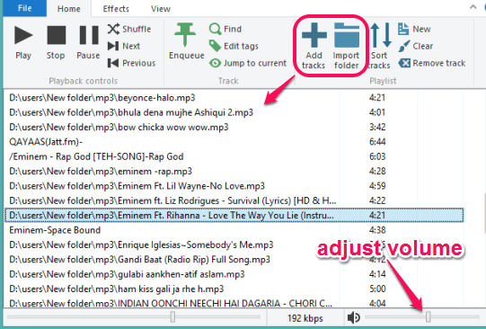 After adding the music files, you can see the list of those files on its interface. On the bottom part of its interface, it provides a slider to view the progress of playing music file, and options to adjust the volume. Bitrate of currently playing song is also visible which I think is a good feature.