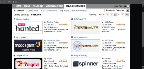 3. Online Services: Another interesting feature of Winamp is the Online services that it provides. When you choose the online services option you can directly browse the internet Winamp website; where you can can add pulgins, skins, and visualizations from here only.