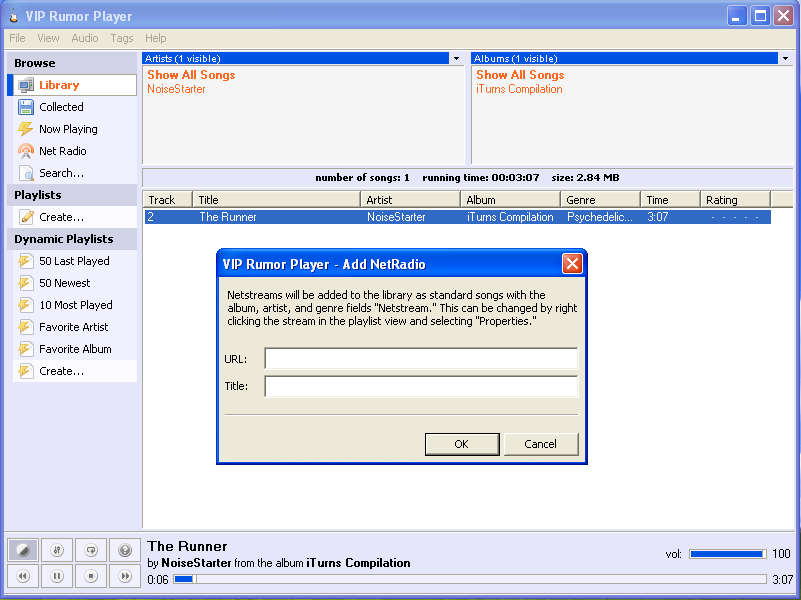 If you are looking for a simple way of how you can listen to online radio channels, the you should really try VIP Rumor. Adding a channel is as easy as clicking on File >> Library >> Add NetRadio.