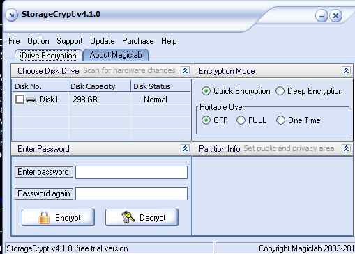 When you start the application all the drives present in your system will be automatically added to the list, be it the removable or the permanent disk. You can choose the disk you want to encrypt and password protect. Just select the drive and set the password in both the fields: Enter password and Password again. Choose the option between whether you want the quick encryption or deep encryption. And choose the portable usage between: OFF, FULL, and One Time. Then click on Encrypt. The encryption will be done in few seconds. Whenever you want to decrypt the drive just enter the password and click on decrypt.
