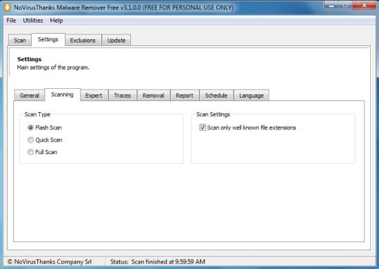 Apart from performing a quick scan, NoVirus Thanks Malware Remover also performs flash scan and full scan for your PC. You can choose any scanning option from the “Settings” tab.