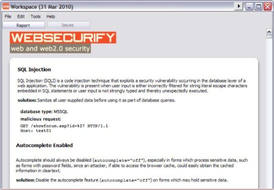 Web Securify is a free robust Web application security testing environment that helps the user to test the security vulnerabilities and technical flaws in the websites. The users, naive and experienced alike, can test the targets for security vulnerabilities and flaws, effortlessly. It automates the testing process.